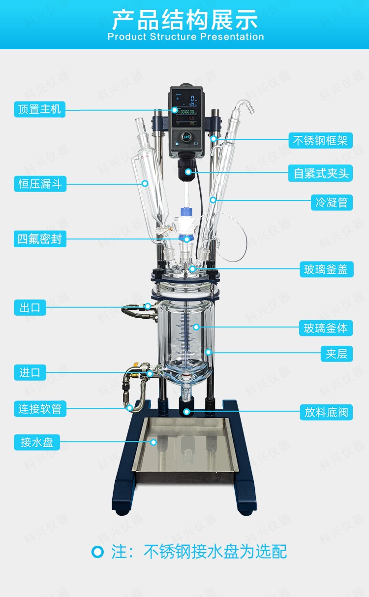 雙層玻璃反應(yīng)釜為雙層玻璃設(shè)計(jì),內(nèi)層放入反應(yīng)溶媒可做攪拌反應(yīng),夾層可通上不同的冷熱源(冷凍液,熱水或熱油)做高溫反應(yīng)(配置相應(yīng)的循環(huán)油浴鍋,溫度可以達(dá)到300℃)或低溫反應(yīng)(配置相應(yīng)的低溫冷凍液循環(huán)系統(tǒng),溫度可以達(dá)到-80℃),也可選擇加熱制冷一體循環(huán)機(jī);在設(shè)定恒溫條件下,在密閉的玻璃反應(yīng)器內(nèi),可根據(jù)使用要求在常壓或負(fù)壓條件下進(jìn)行攪拌反應(yīng),并能做反應(yīng)溶液的回流與蒸餾,使用中可以抽成真空,從而做真空反應(yīng)。是現(xiàn)代精細(xì)化工、生物制藥和新材料合成的理想中試、生產(chǎn)設(shè)備。它的這種設(shè)計(jì)使試驗(yàn)更加的安全,更加的方便。